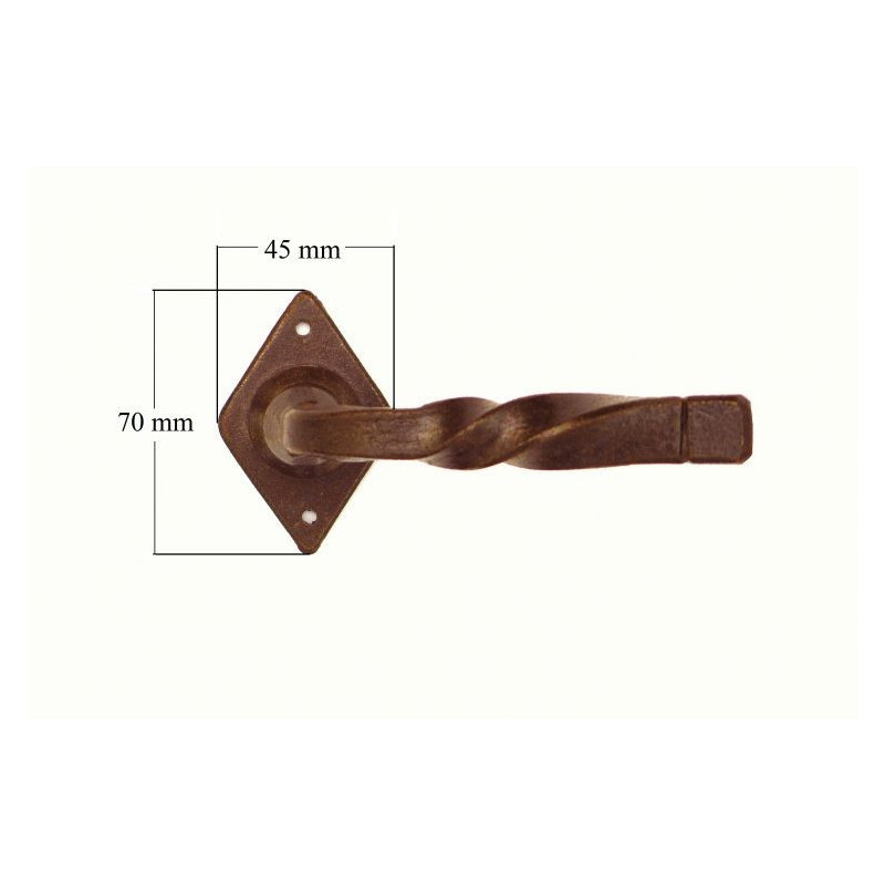 Klamka żelazna jest ręcznie kuta zgodnie z tradycyjną obróbką metali. Dzięki specjalnemu procesowi żelazo jest postarzane w sposób naturalny, bez używania koloryzujących farb czy też kolorowych wosków. Na koniec procesu każdy produkt jest pokrywany cienką warstwą ochronną i wypalany w piecu. Dzięki temu wygląd jest bliski antycznemu oryginałowi.