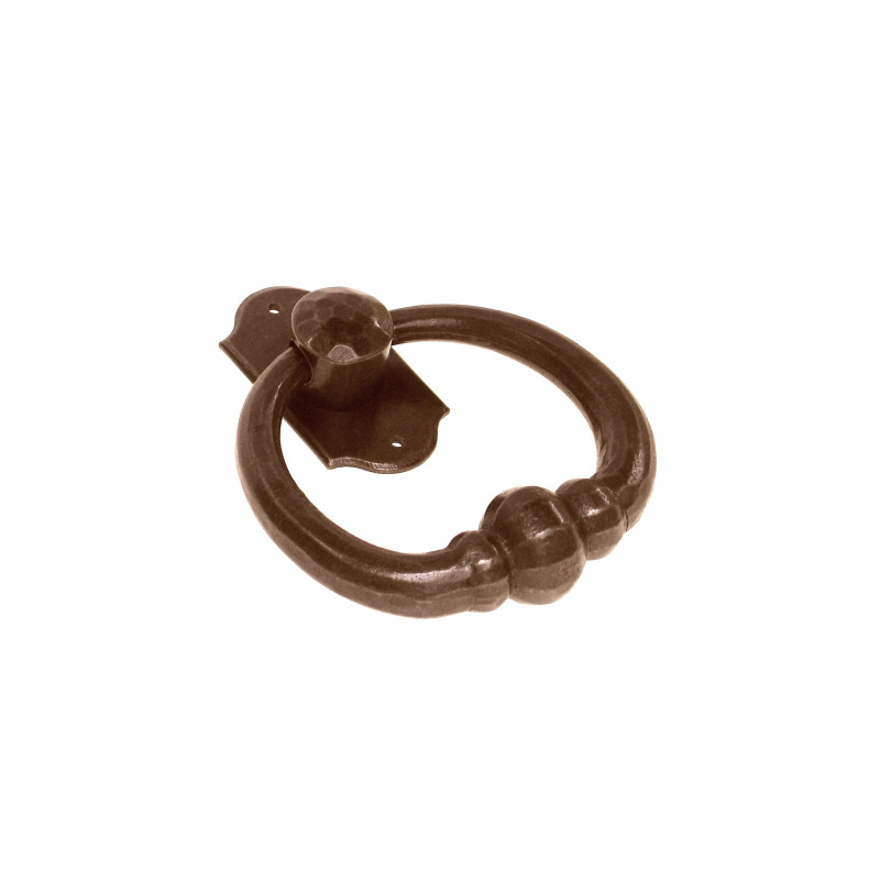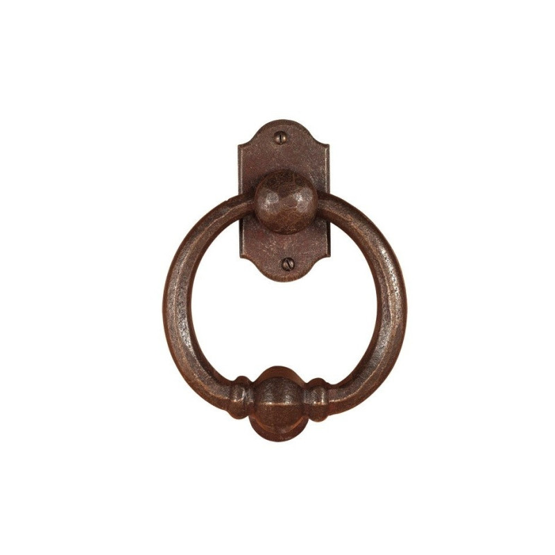 Kołatka do drzwi wykuta ręcznie z metalu w stylu rustykalnym.